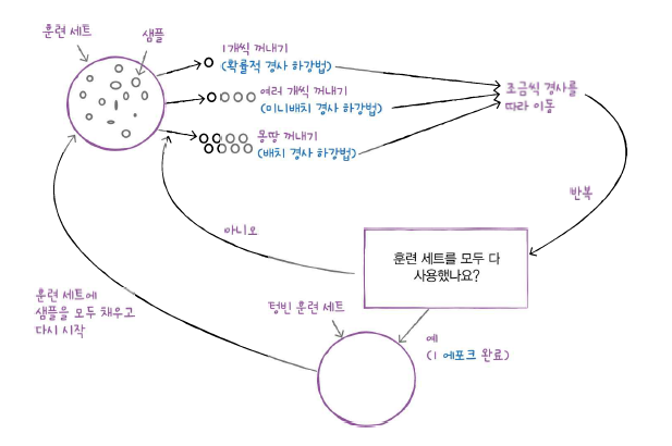 훈련 세트에서 샘플 하나씩 꺼내 손실 함수의 경사를 따라 최적의 모델을 찾는 알고리즘.